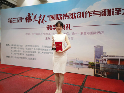 4月7日上午,由浙江大学、中美诗歌诗学协会、北京外国语大学外国文学研究所、《世界文学》杂志社、浙江大学出版社等单位共同举办的第三届“求是杯”国际诗歌创作与翻译大赛在杭州紫金港国际酒店举行颁奖典礼。公司永利yl234552018级俄语专业研究生张颖坤同学以翻译作品《十一月挽歌》荣获全国翻译类二等奖。这是公司俄语专业研究生继第二届“求是杯”获得奖项之后又一次获奖。