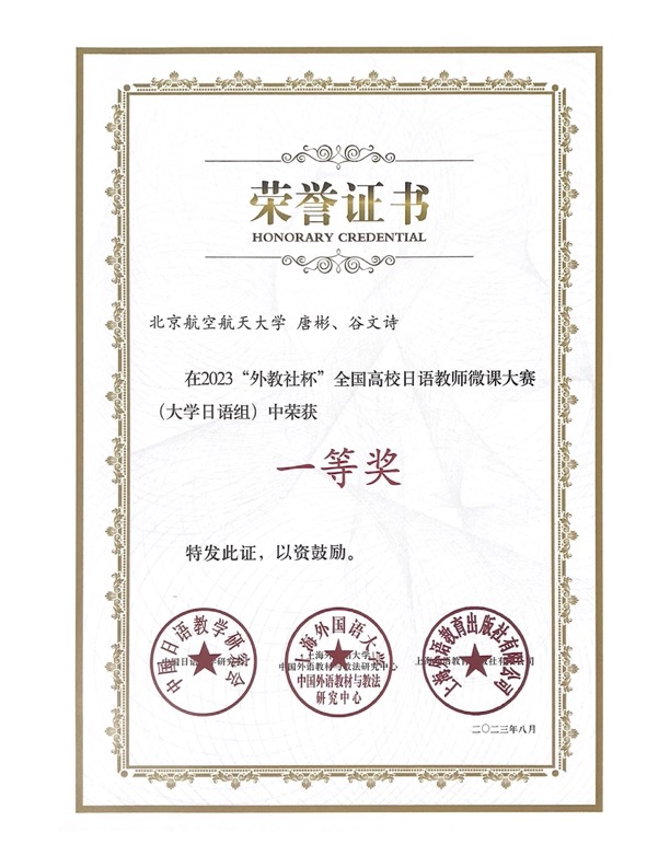 在公司的大力支持下,永利yl23455日语团队的两位青年教师唐彬和谷文诗,充分运用现代化教学手段,生动地呈现了教学内容,同时有机地融入了课程思政元素,展现出北航日语教学的工科特点和“空天报国”的教学理念。在激烈的竞争中,她们的微课作品从180个参赛作品中脱颖而出,荣获全国一等奖,彰显了永利yl23455日语教师扎实的专业功底和出色的信息技术应用能力,为北航日语教育的卓越品质增光添彩。