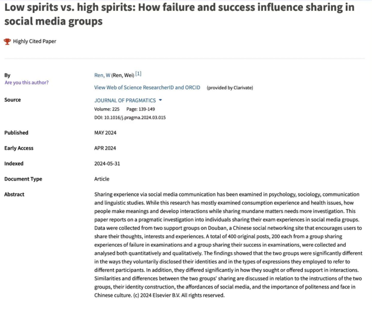 近日,据“基本科学指标数据库(Essential Science Indicators,简称ESI)”发布的最新数据显示,永利yl23455任伟教授发表于国际顶尖期刊《Journal of Pragmatics》(《语用学杂志》)的学术论文“Low spirits vs. high spirits: How failure and success influence sharing in social media groups”成功入选全球“高被引论文(Highly Cited Paper)”。