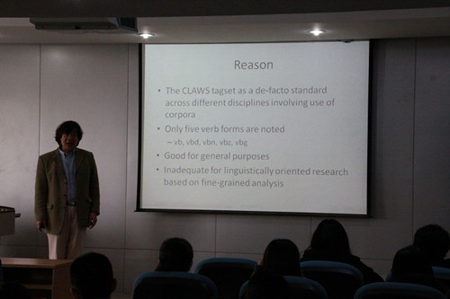 4月19日报告的主题为“学术文本中动词系统研究”。在该讲中,方博士先是阐述了他对学术文本中单词词性在语料库中分布的浓厚兴趣,后以PubMed语料库为研究对象,做了一个生物医学方面学术文本中动词系统的数据分析。在初步研究过程中,方博士发现现有的标注软件CLAWS对单词词性的分类并不具体,无法胜任如此精细的标注工作,于是他和他的团队开发了一套新的标注软件,尤其在动词的细分上能够达到研究要求。随后,方博士对其团队在建库,关键词集,标注,分词,语义处理方面做了细致的介绍并向我们分享了初步的成果和遇到的问题。