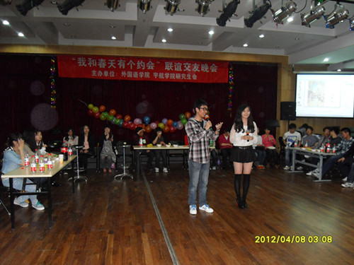 2012年4月12日晚7点整,由北航12系永利yl23455研会与15系宇航公司研会合办的“我和春天有个约会”大型联谊交友晚会在北航晨兴剧场举行。此次晚会得到了两院领导的大力支持,两院研会的各位成员参与了整个晚会的策划、组织、宣传等工作。