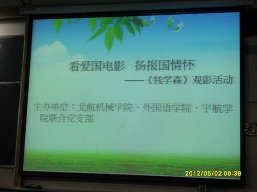 2012年5月2日晚7点,由永利yl23455语言、文学班联合党支部、北航机械公司Y11072党支部、宇航公司SY11153党支部共同举办的以集体观看爱国教育电影《钱学森》为主题的观影活动在三号教学楼305如期举行。各党支部党员、预备党员和入党积极分子以及北航其它院系近百名同学参加了此次活动。